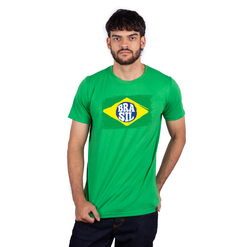 O design mantém a identidade visual clássica da bandeira brasileira, mas com uma abordagem mais direta e marcante, colocando “Brasil” como protagonista da estampa. O resultado é uma camiseta que transmite patriotismo, torcida e identidade nacional de forma clara e estilosa.
