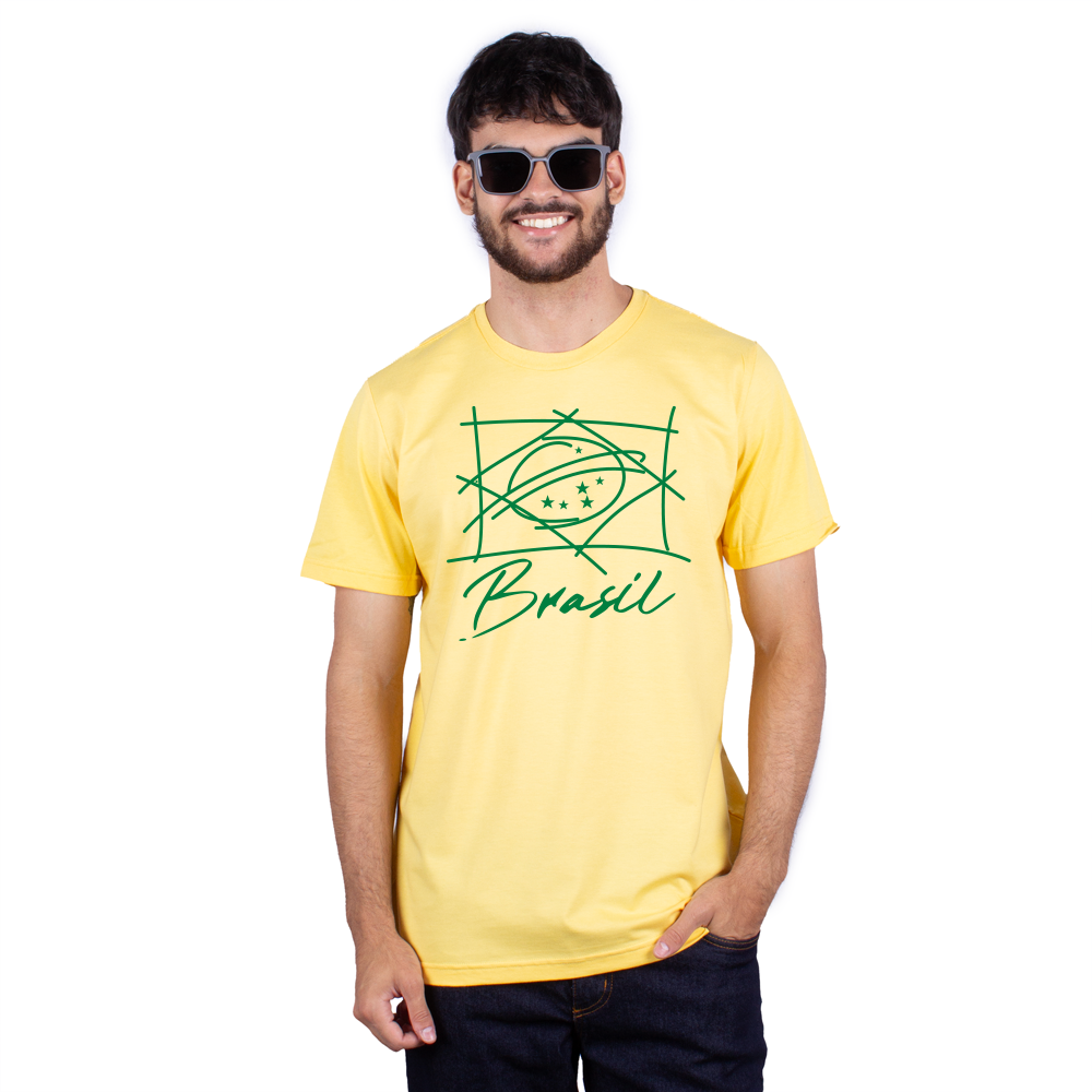 O design mantém a identidade visual clássica da bandeira brasileira, mas com uma abordagem mais direta e marcante, colocando “Brasil” como protagonista da estampa. O resultado é uma camiseta que transmite patriotismo, torcida e identidade nacional de forma clara e estilosa.